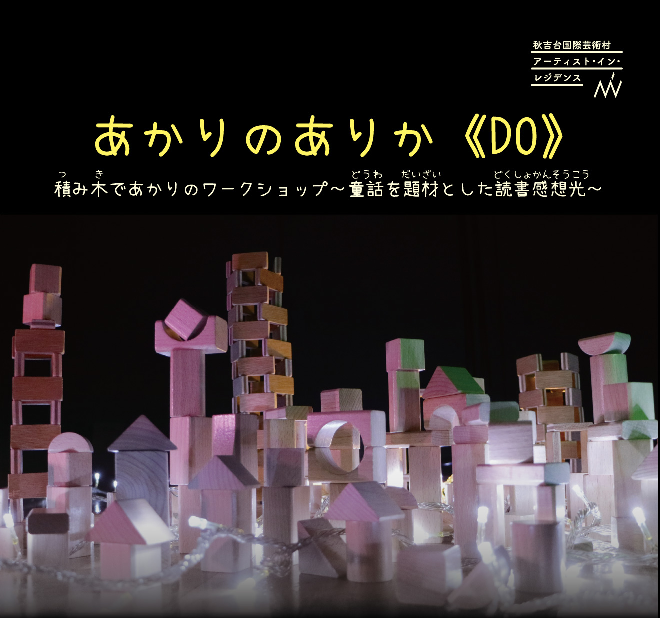 私たちは、光と影の美を主題とした子どもたちの遊び環境について研究している。その一環として、「あかりの良否は光源・反射材・遮蔽材のバランスによる」という知見を、子どもたちが体験的に学ぶアート・サイエンスコミュニケーション活動として、「童話を題材とした積み木であかりのワークショップ」の教材開発と普及実践に努めている。題材童話「あかりのありか《DO》」は、主人公である紙飛行機のこーきが秋芳洞内部の幻想的な光やあかり、色とりどりの場所を訪ねるストーリーだが、こーき以外の絵は描かれていない。こーきが目撃したもの、すなわち子どもたちが童話を読んで想像した場面を積み木とLEDで「読書感想光」として表現する。