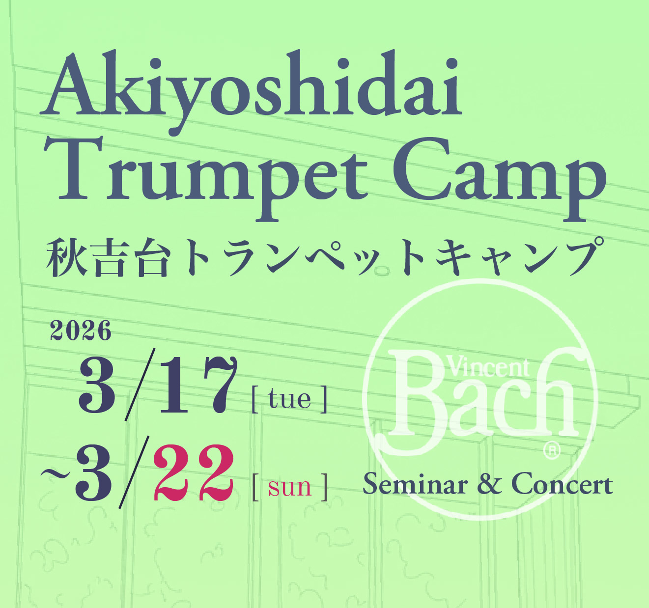 | 日時 | 前期クラス(対象:高校生以上) 2026年3月17日(火)~20日(金・祝) 後期クラス(対象:中学生以上) 2026年3月20日(金・祝)~22日(日) 秋吉台トランペットキャンプ ガラ・コンサート 2026年3月20日(金・祝)15:00開演 |