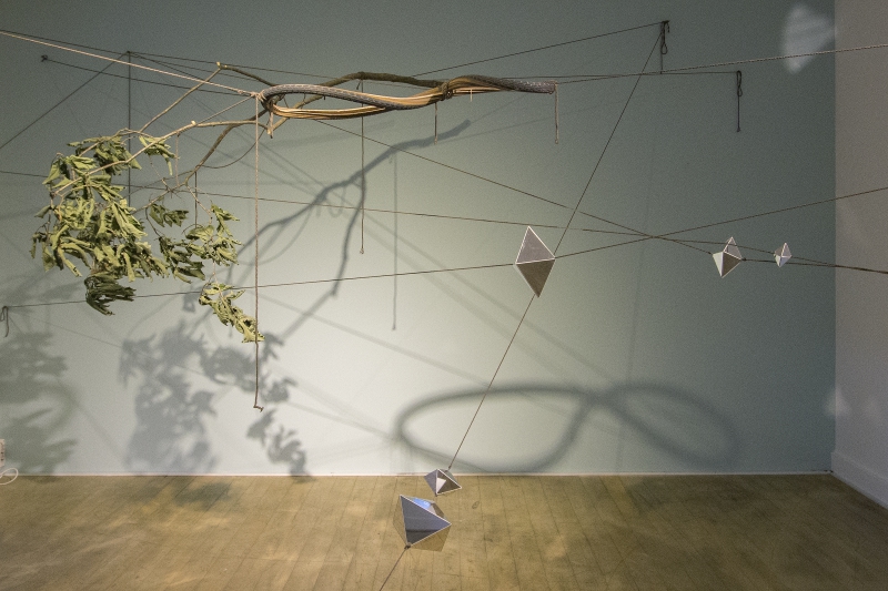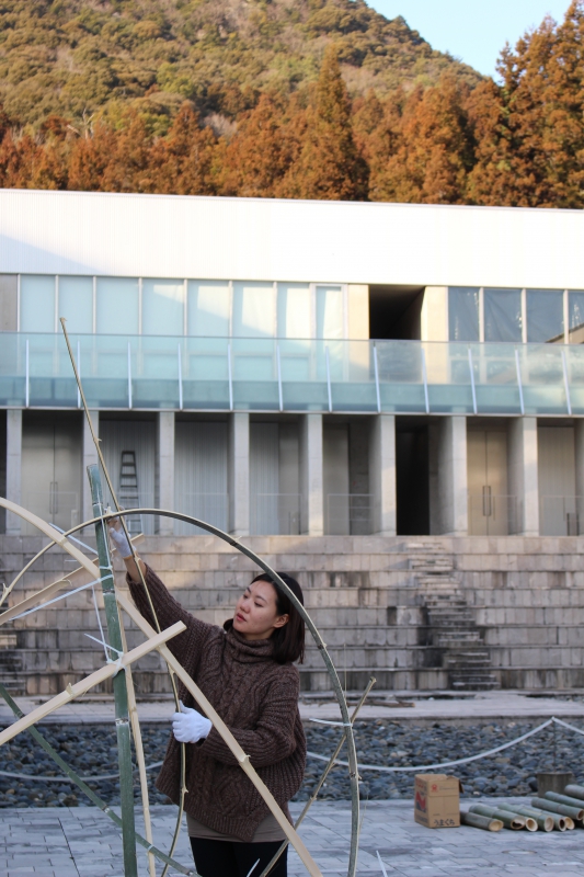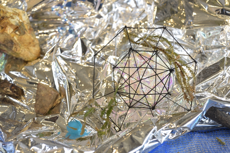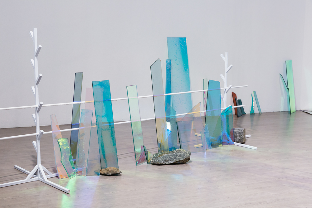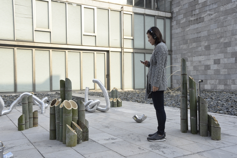 秋吉台国際芸術村では『カモフラージュする惑星に不時着するためのガイド』と題し、周辺で収集した様々な素材と芸術村敷地内の5つのスペースで構成されるインスタレーション作品を発表した。観客は作家によって決められたルートを、地図と共に、SF的なストーリーや抽象的な定義などが語られる音声ガイドにしたがって歩き、各スポットで作品群に出会うのである。スジンは作品を通し、我々をまだ見ぬ22世紀の仮想世界へといざなった。